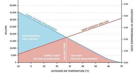However, these systems are typically designed to accommodate this derated capacity as the temperature continues to drop. Regardless, one-to-one and packaged heat pump systems are limited in how much heat they can provide at very cold temperatures. Below the “balance point” of derated heat pump capacity and building heating load, supplemental heat becomes necessary, typically in the form of some electric resistance heaters.