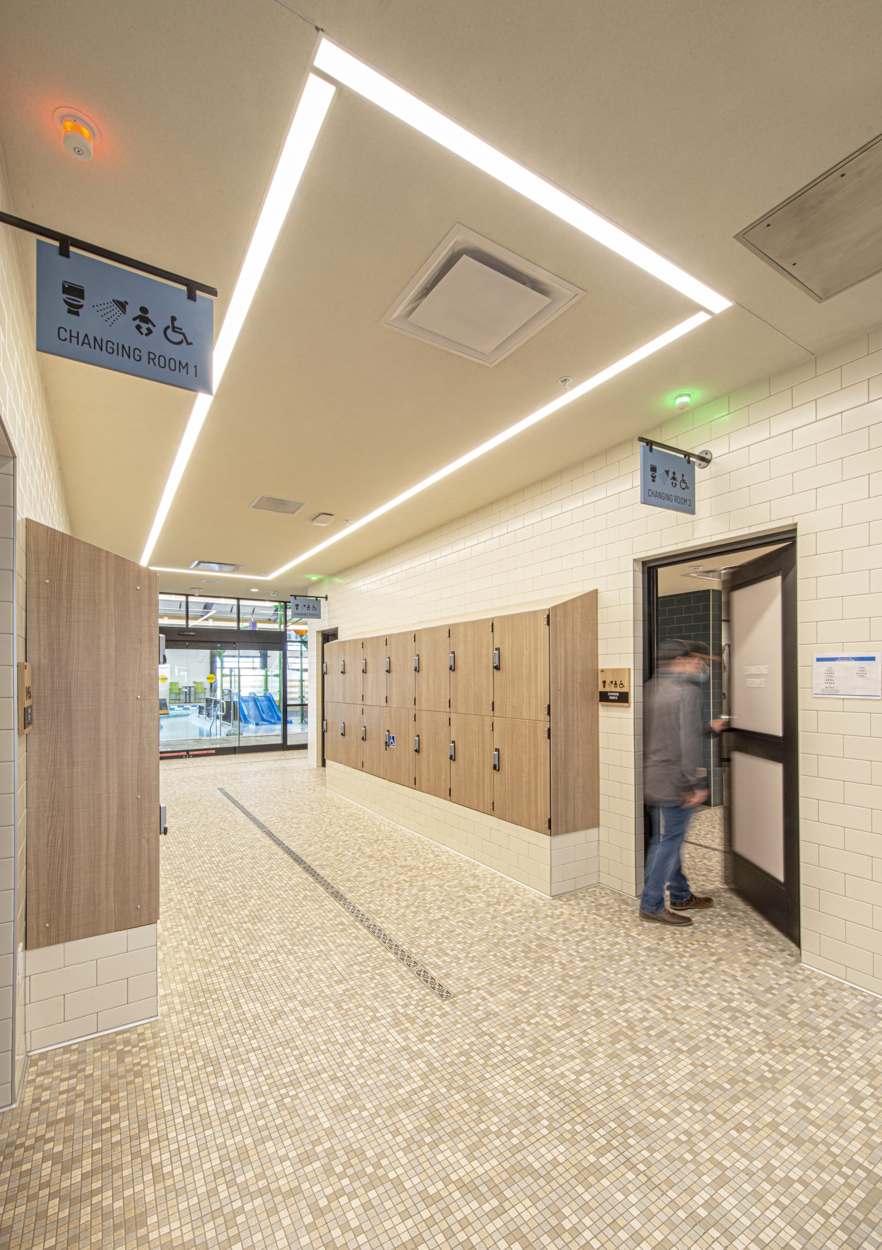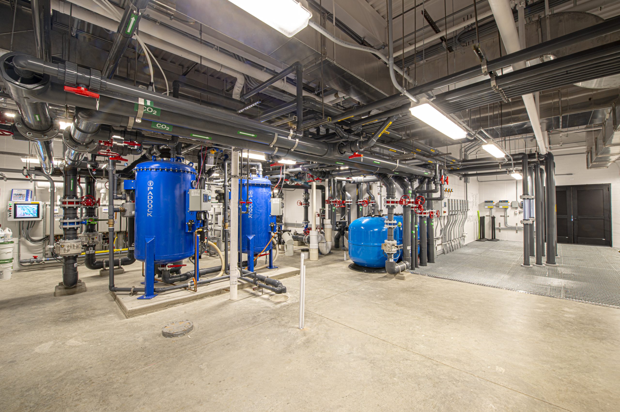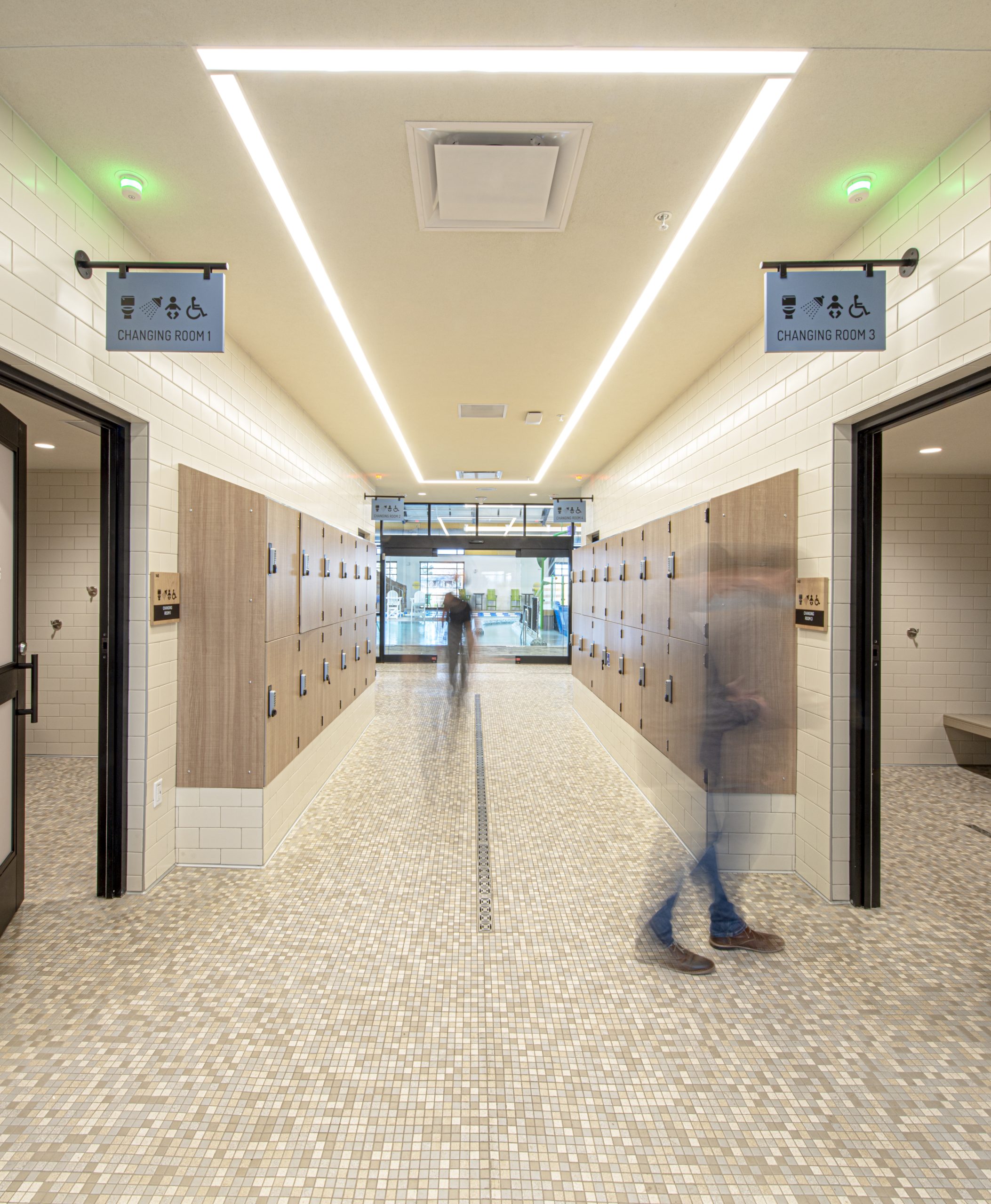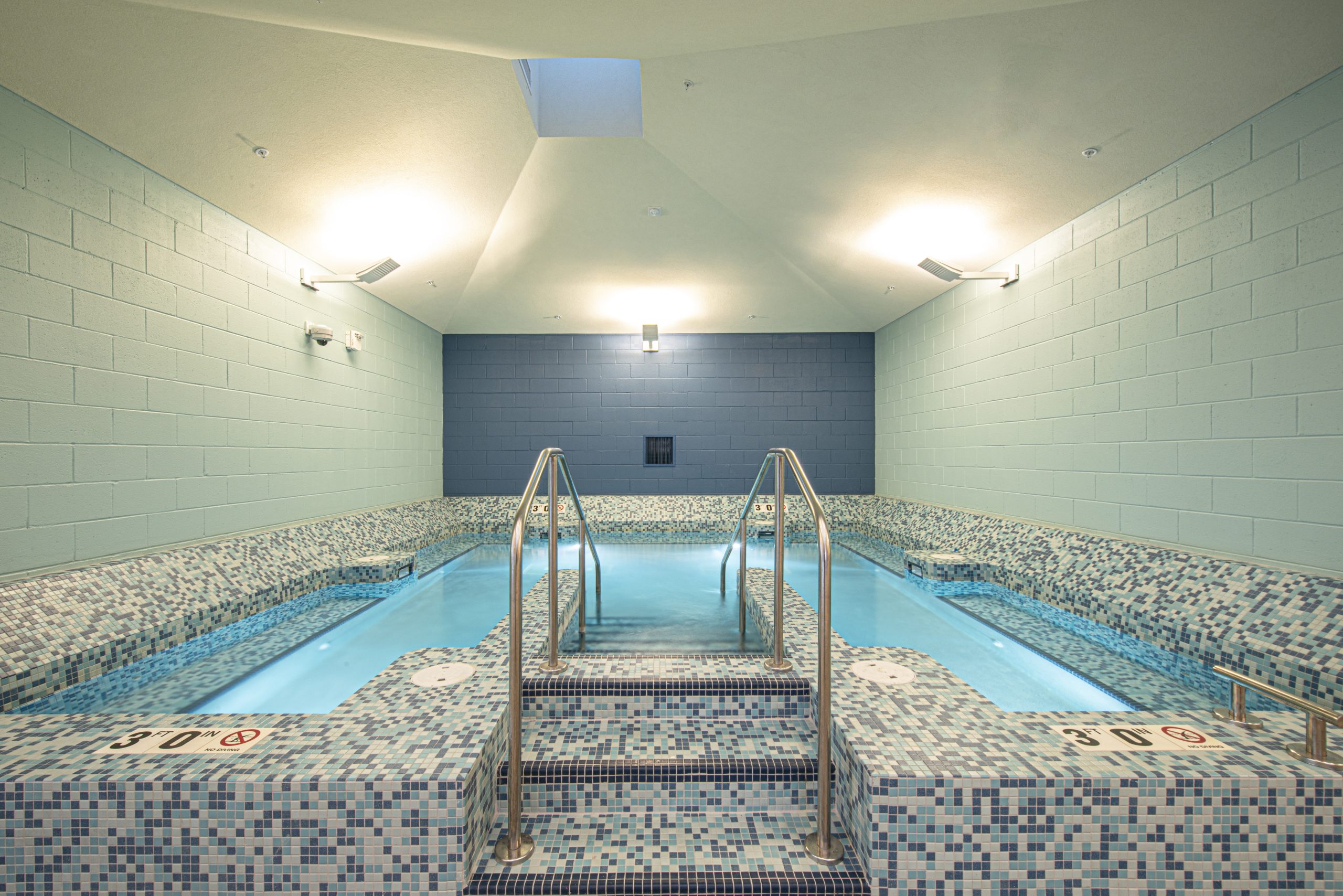 • Air quality and efficiency: close coordination with the pool designer to implement deck-level exhaust for improved natatorium air quality, along with high volume, low speed fans in the large open areas for destratification, comfort, and reduced energy use